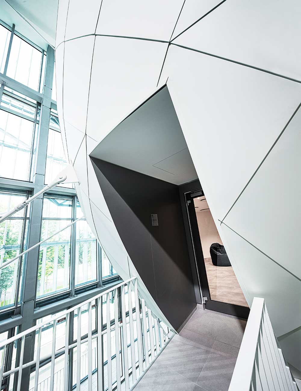 «Avevamo valutato diverse ipotesi su come realizzare il guscio della struttura di acciaio», spiegano gli architetti. In considerazione del peso specifico ridotto – intorno a 2 Kg/mq – e della malleabilità del materiale la scelta è caduta sui nastri di alluminio PREFALZ da 0,7 mm con verniciatura in qualità P.10.