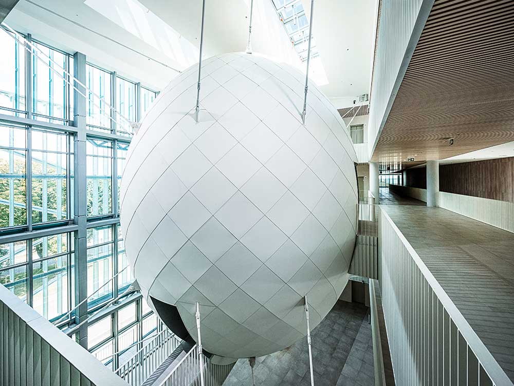 Visibile, grazie alle ampie vetrate e al bianco puro del rivestimento, anche dal resto degli edifici del campus universitario, la struttura – del peso di 88 tonnellate – ha una forma ovoidale ed è letteralmente sospesa nello spazio dell’atrio, collegata con una passerella a un corridoio di distribuzione e ancorata all’edificio con otto cavi di acciaio.