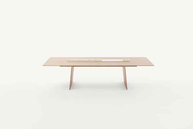 I nuovi tavoli da interno Kanji (design Francesco Rota) hanno dimensioni importanti e sono realizzati completamente in legno. La loro particolarità è il piano, che può essere intero o avere la fascia centrale divisa in elementi indipendenti: è possibile rimuovere il numero desiderato di elementi e sostituirli con un tagliere in gres e con contenitori di diversa misura in metallo verniciato. Gli elementi rimossi possono essere conservati in un vano posto sotto il piano.