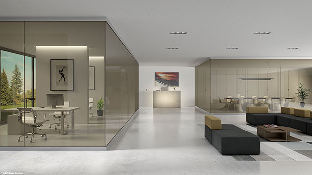 Nell’immagine, il nuovo vetro stratificato di sicurezza Stratobel Colour nella variante cromatica Terra Brown definisce gli spazi, conferendo carattere all’ambiente (©Miysis Studio 3D).