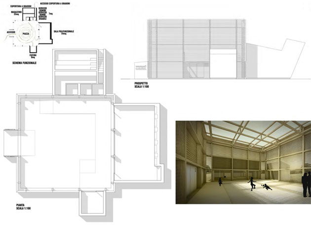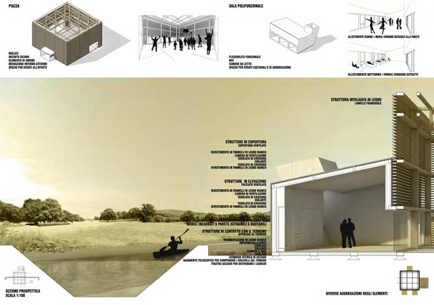 Il concorso ha esaminato i progetti per le strutture di servizio previste sui percorsi fluviali dell’Expo 2015, premiando la soluzione ideata dall’architetto Fabrizio Fiscaletti, laureato in architettura all’Alma Mater Studiorum di Bologna. Il Recinto Rurale è un padiglione cubico con struttura aperta in legno lamellare, concepito come nuovo modello di ‘piazza’ non per la sua conformazione architettonica ma in quanto luogo in cui si condensa e si svolge la vita sociale, come vuole la tradizione delle città italiane. Questa valenza simbolica si lega alle caratteristiche spaziali di una struttura intelaiata di legno in vista, una forma semplice chiusa/aperta su base quadrata di circa 12×12 m con piccole strutture polifunzionali aggregate al perimetro.