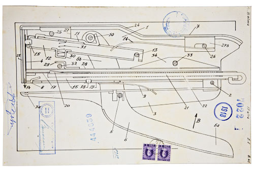 Cucitrice a pinza per punti metallici, con elemento di magazzino e guida oscillante ed estraibile, e con dispositivi di sicurezza dei congegni di chiusura. Aldo Balma, Voghera (PV), 26 gennaio 1949