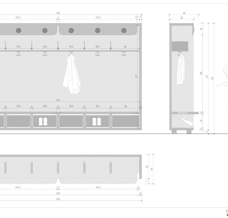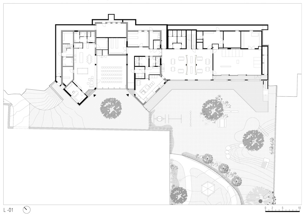 Il livello -1 dell’edificio esistente è stato concepito come uno spazio condiviso dedicato ai tre programmi funzionali, permettendo alla sala polifunzionale che può ospitare 50 persone, alla mensa e alla palestra di creare una serie di ambienti utilizzabili anche in orari extrascolastici dalla collettività, in occasioni pubbliche come eventi, rappresentazioni scolastiche, incontri.