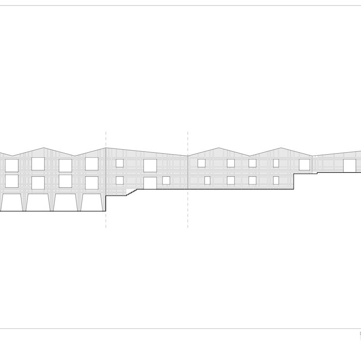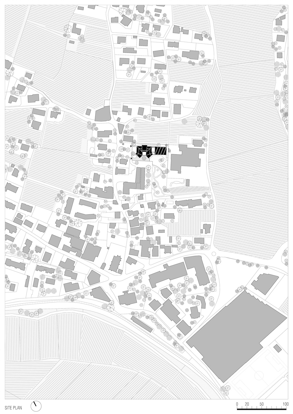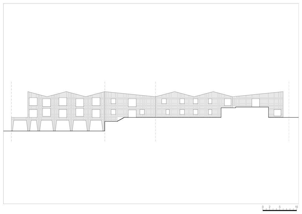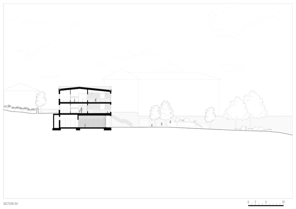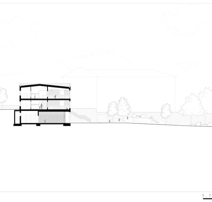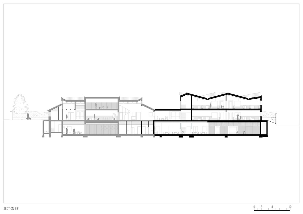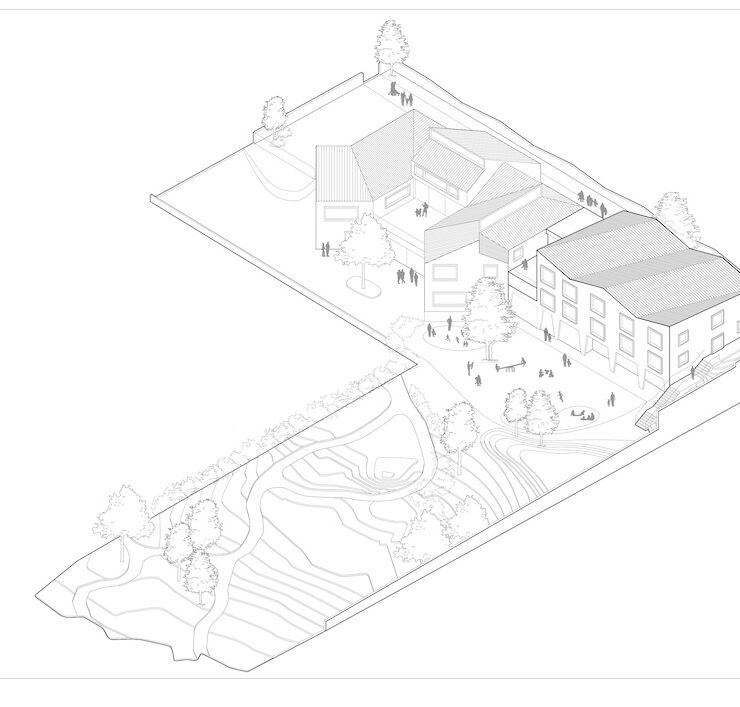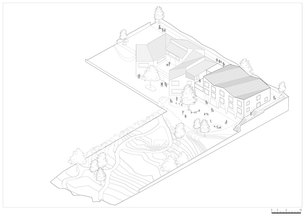 La morfologia dei due edifici, il preesistente e il nuovo, si adatta alla conformazione del sito, caratterizzato da una differenza di quota di 4 metri da nord a sud. Al piano terra, lungo il margine a nord dell’area, sono collocati gli ingressi distinti per l’asilo nido e la scuola dell’infanzia, mentre l’accesso al centro giovanile è situato sul lato sud dell’edificio, al livello inferiore.