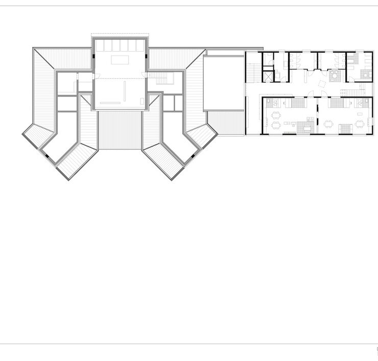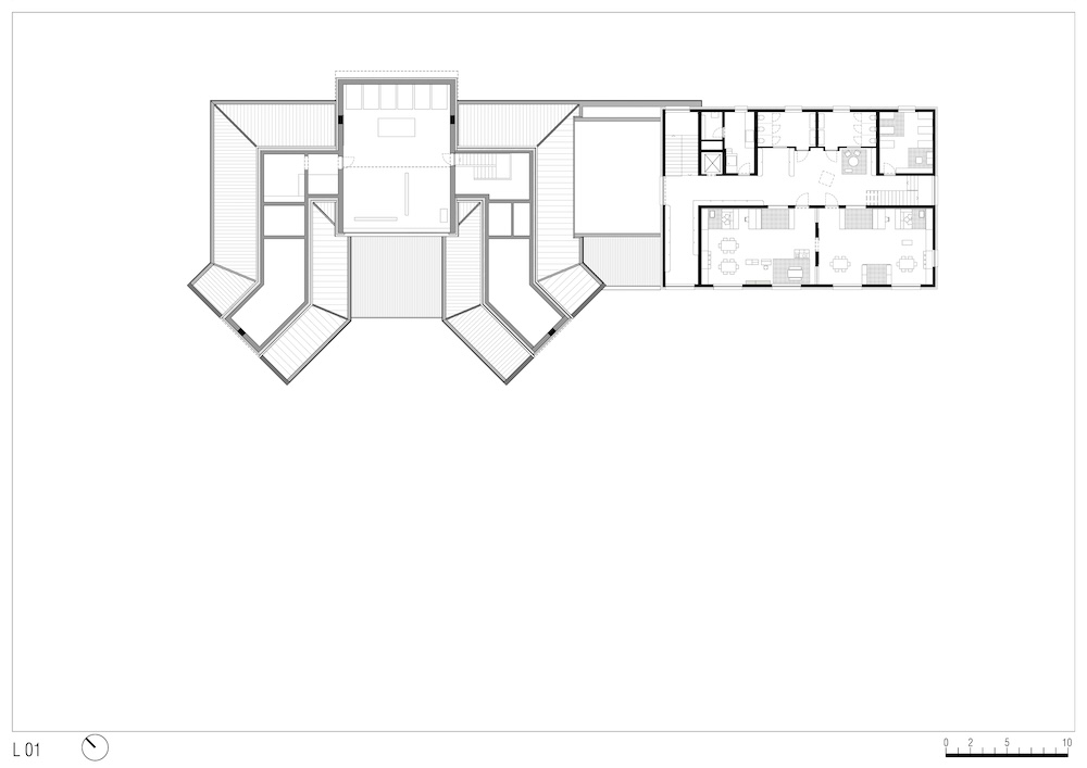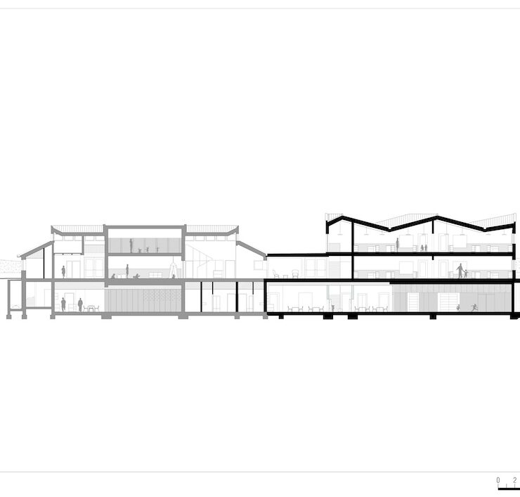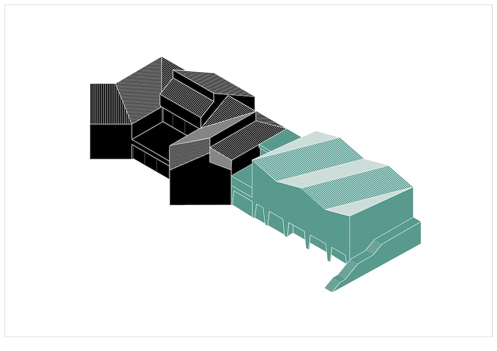 Sebbene collegato in pianta e in sezione, il nuovo ampliamento progettato da ModusArchitects si presenta come un volume distinto e indipendente sul piano semantico rispetto al profilo disordinato dell’edificio esistente.