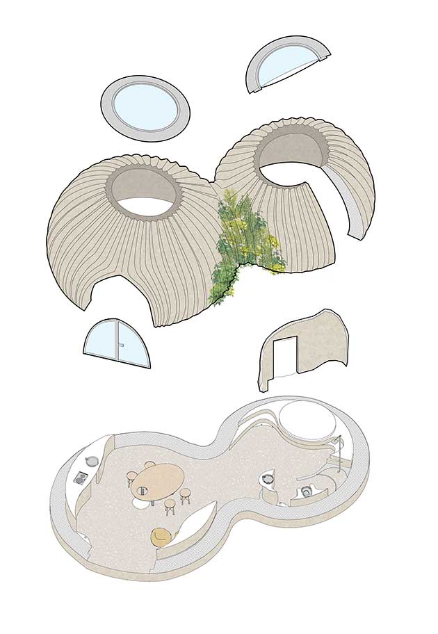 | Gli elementi dell´abitazione nello spaccato assonometrico (© Mario Cucinella Architects) |