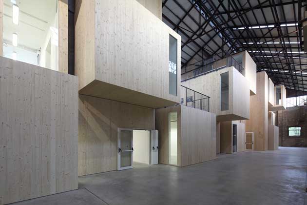 | I laboratori sono realizzati attraverso la composizione di blocchi in legno: l´uso di materiali naturali conferisce all’architettura valore materico (foto © Kai-Uwe Schulte-Bunert) |