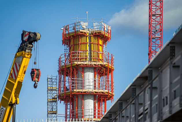 Per la fase di elevazione delle pile è stata utilizzata la cassaforma per pareti VARIO GT24 abbinata al sistema di ripresa PERI RCS con guide; queste ultime hanno permesso il sollevamento dell’unità di ripresa in sicurezza, nonostante le sollecitazioni dovute al vento (Foto © Alberto Brevi). |