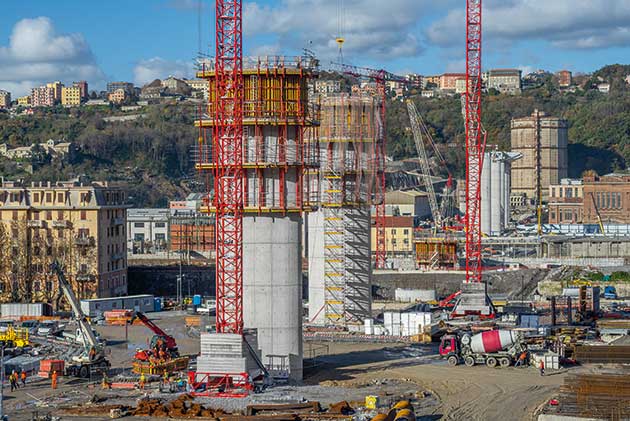 Alla sua costruzione, oltre a Salini-Impregilo e Fincantieri, partecipano decine di imprese tra le quali Peri, che ha fornito sistemi e soluzioni di casseforme all’avanguardia utilizzati per la realizzazione dei plinti di fondazione e per le 21 imponenti pile in calcestruzzo armato (18 per il ponte e 3 per le rampe di accesso) alte fino a 39 metri.