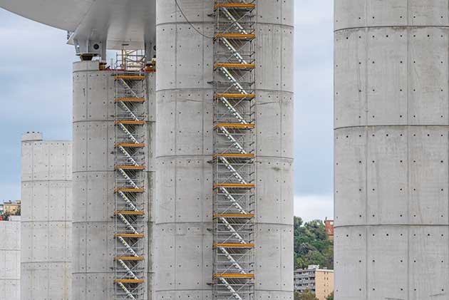L’accesso in sicurezza e con grande agio alle diverse aree di lavoro è garantito dall’impiego delle scale d’accesso monodirezionali PERI UP Flex 75, alte fino a 40 metri (Foto © Alberto Brevi). |