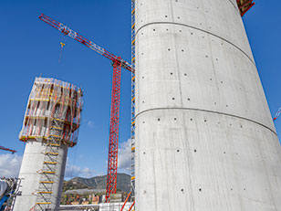 Vario è stato utilizzato per la realizzazione delle pile con altezze fino a 39 metri e una sezione di forma ellittica di 9,50 x 4,00 metri; per l’elevazione sono state impiegate cinque unità di cassaforma Vario GT24, con cicli di getto di 4,50 m di altezza e 2 unità per la realizzazione della rampa di accesso.