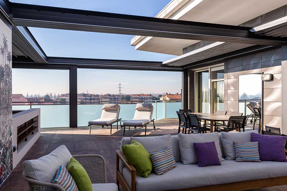 Un progetto sartoriale realizzato grazie alla soluzione Gennius ISOLA 3 di KE: tre pergole a tetto piano a impacchettamento, corredate da chiusure laterali invernali in PVC Cristal, tende a rullo filtranti Vertika e luci LED dimmerabili perimetrali, il tutto gestito da un sistema di domotica azionabile con comandi vocali.