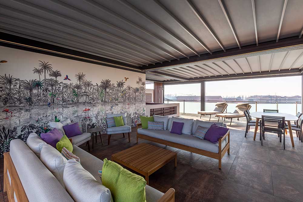 La versatilità e le personalizzazioni dei prodotti KE hanno consentito di realizzare un progetto custom dal carattere unico: il grigio antracite della pergola e il telo grigio chiaro Vintage – dalla vocazione tessile – si armonizzano con il wallpaper dallo stile jungle scelto per la parete, le luci soffuse a faretto e gli arredi dai colori neutri.
