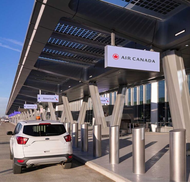 La grande tettoia circolare – l’elemento più appariscente del padiglione, sulla quale sono collocati 8.000 mq di cellule fotovoltaiche integrate in pannelli di vetro – ombreggia l’ampia corte centrale, modellata in fase di progetto in modo da favorire la circolazione delle brezze più fresche di sud-ovest bloccando invece i venti più caldi.