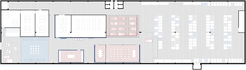 I visitatori sono accolti in una prima area bar che li introduce alla pedana color blu elettrico, area polifunzionale in cui viene esposta e presentata una storia diversa in base ai visitatori e al momento.