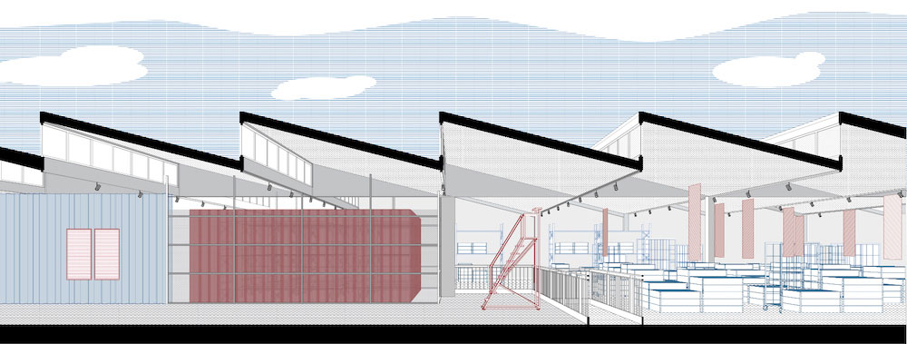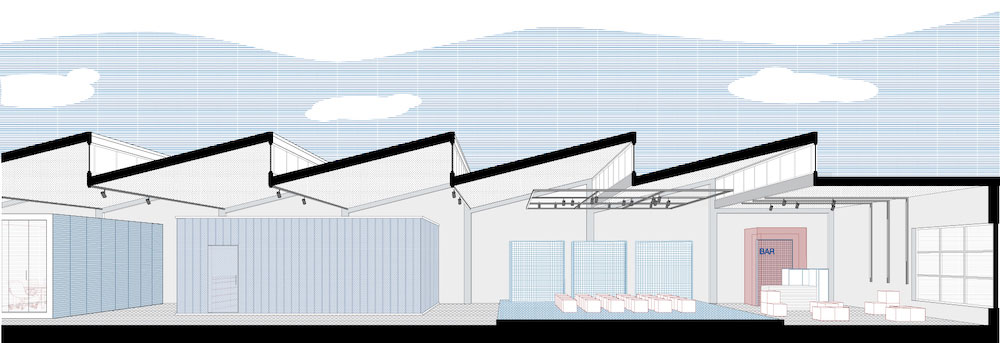 I diversi volumi si alternano in un gioco di texture, colori e materiali che prendono forma e cambiano veste tramite un uso sapiente della luce. Diventa così uno spazio dove ogni elemento dialoga con gli altri e con l’architettura industriale in un gioco di luci e ombre secondo una precisa scenografia luminosa.