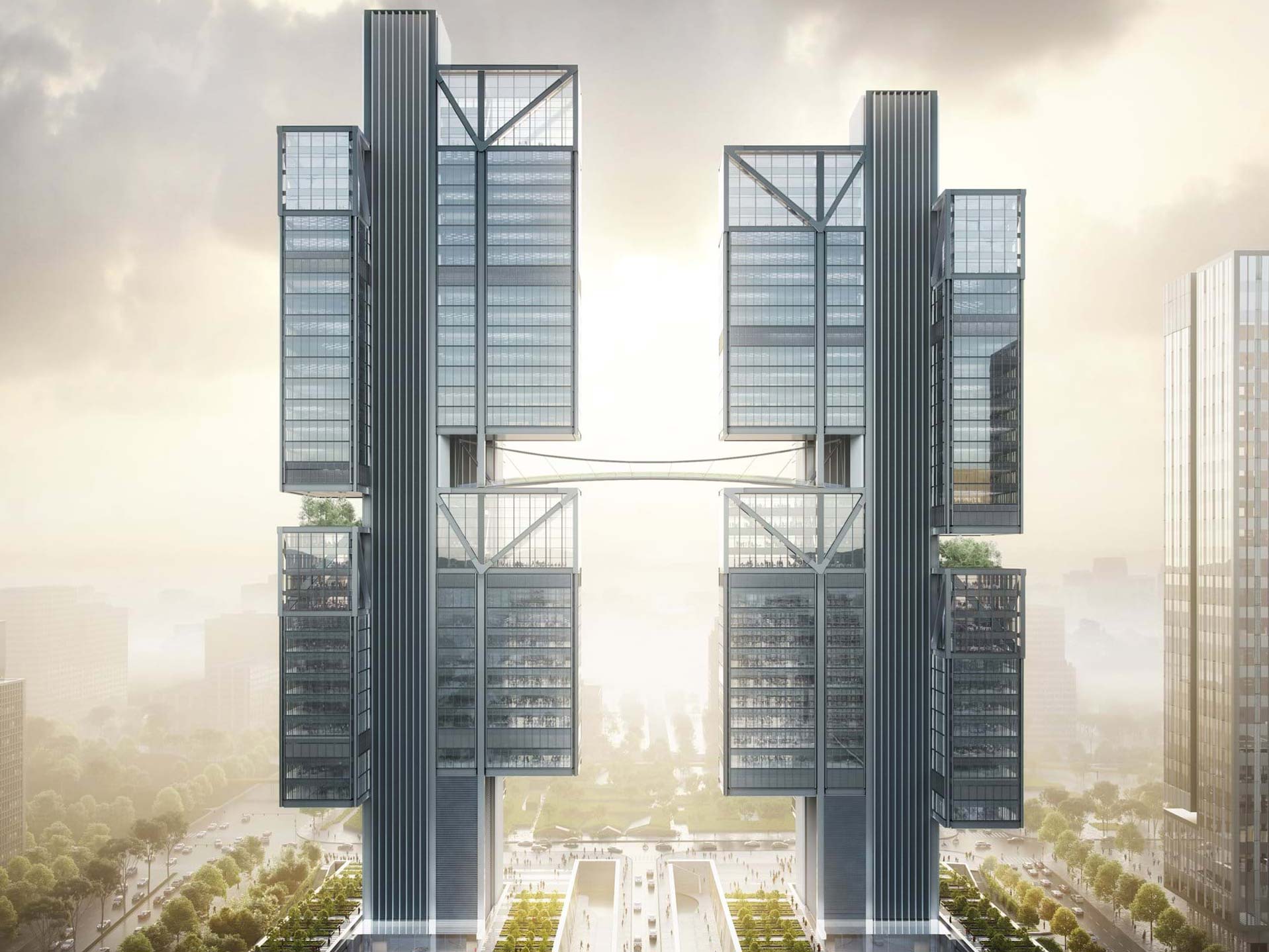 I dipendenti e collaboratori della società, famosa nel mondo per le sue linee di droni consumer e specializzata in strumentazioni innovative per il rilievo e la georeferenziazione professionale, troveranno posto in due torri gemelle che rivoluzionano il concetto tradizionale di ufficio dando spazio a un’idea di comunità sospesa nel cielo: i diversi piani appaiono come volumi trasparenti che megastrutture in acciaio fissate a core centrali sospendono nello spazio.