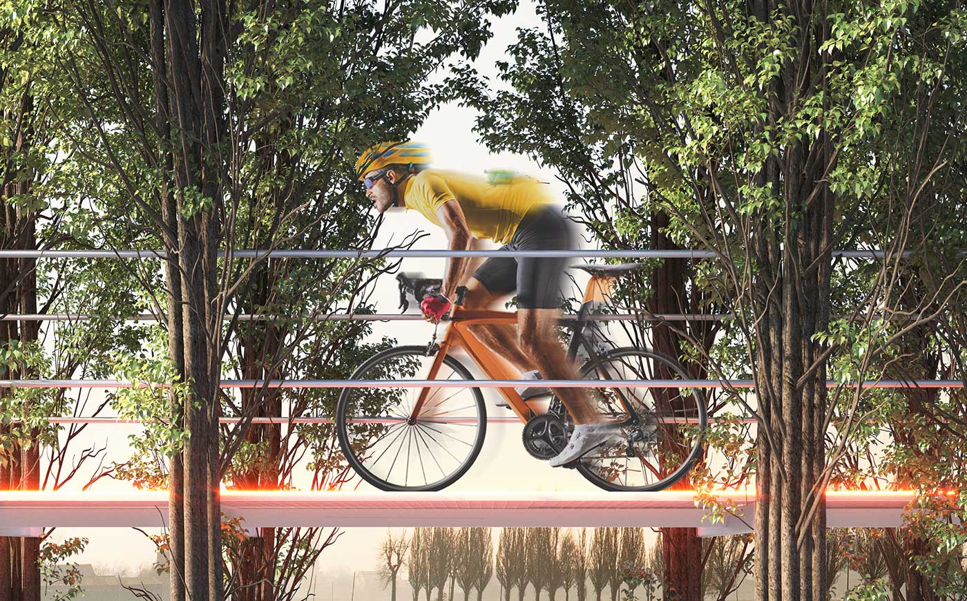 Poggiato su due file parallele di piante che fungono da pilastri, il percorso potrebbe collegare la Ciclovia Vento – la ciclabile di oltre 700 km progettata dal Politecnico di Milano che correrà lungo gli argini del fiume Po da Venezia a Torino – con Sabbioneta, patrimonio mondiale dell’Unesco, mentre sensori integrati nel verde tracceranno le condizioni ambientali in tempo reale.