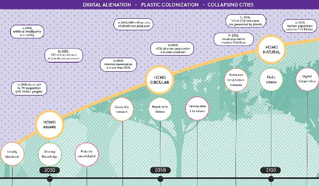 L´evoluzione umana sarà nuovamente in grado di ripristinare le sinergie con il pianeta se tiene conto del raggiungimento dei 17 obiettivi delle Nazioni Unite entro il 2030, della creazione di una grande economia circolare entro il 2050 e infine di immaginare la costruzione di comunità interconnesse entro il 2100.