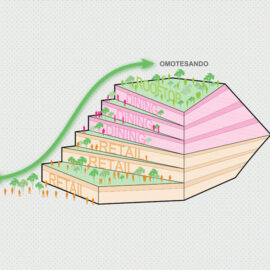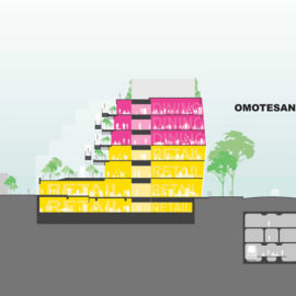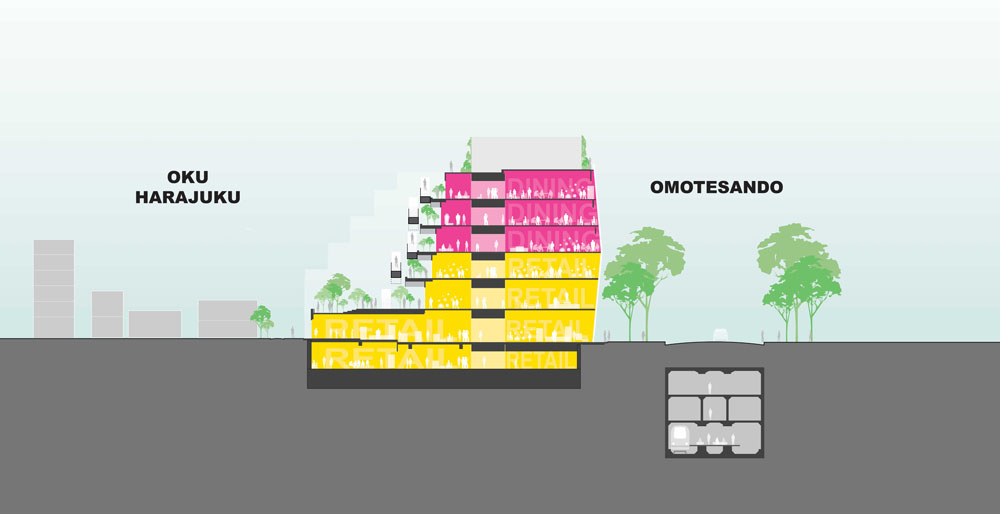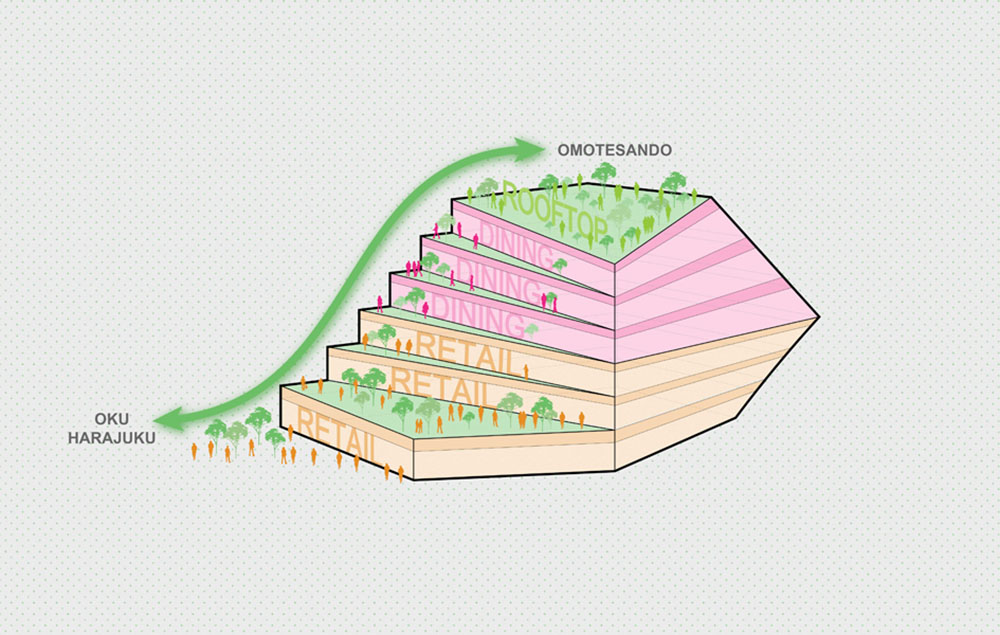 Le facciate avranno un design differente a seconda del quartiere verso il quale sono rivolte. L’intero progetto infatti nasce come conseguenza di un processo di rigenerazione urbana destinato a creare un punto di congiunzione tra due quartieri estremamente diversi fra loro. Omotesando ha una forte identità urbana definita da edifici alti, ampie strade con alberi di zelkova, gli olmi giapponesi, e soprattutto da scenografici spazi commerciali di grandi brand internazionali. Mentre Harajuku, il quartiere contrapposto, ha coltivato negli anni una propria cultura giovanile ed è caratterizzato prevalentemente da uno sviluppo a misura d’uomo con edifici bassi, strade strette, negozi indipendenti.