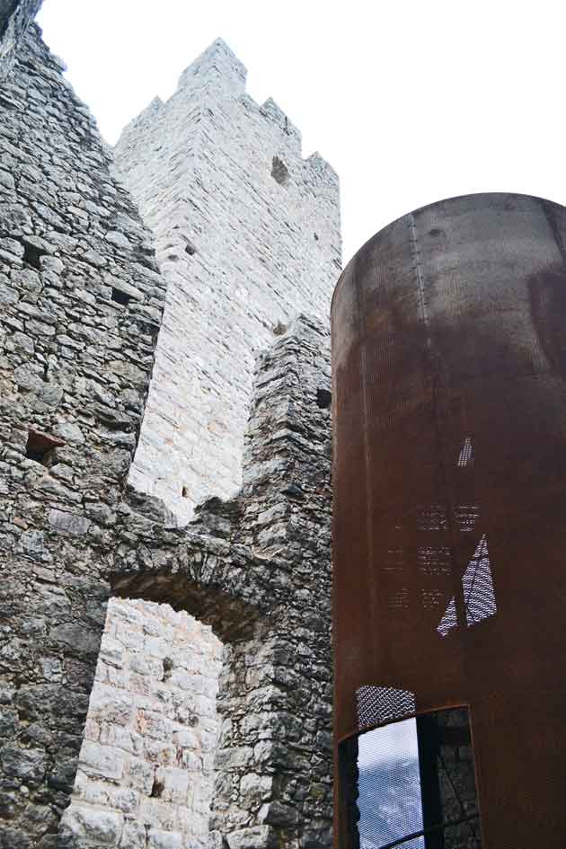 L´intervento su Castel Belfort, che è valso a Chiara M.A. Bertoli uno dei premi di Costruire il Trentino 2009/2012, ha comportato il consolidamento statico delle situazioni più critiche e la sistemazione degli spazi esterni, procedendo inizialmente al restauro della rampa che giunge al portale d’ingresso in pietra databile agli inizi del XVIII sec.. Alta circa 21 metri, la torre è l’unica testimonianza del primo nucleo castellano del XIV secolo, gravemente danneggiata dalla perdita degli orizzontamenti lignei e da un incendio che distrusse il palazzo alla fine del ´600. Nella parte superiore sono stati inseriti ancoraggi iniettati di tipo passivo sia orizzontali che sub-orizzontali della stessa tipologia impiegata anche per il consolidamento dell’angolo nord-est della cinta muraria esterna, dove le barre di cucitura sono ancorate al substrato roccioso della muratura.