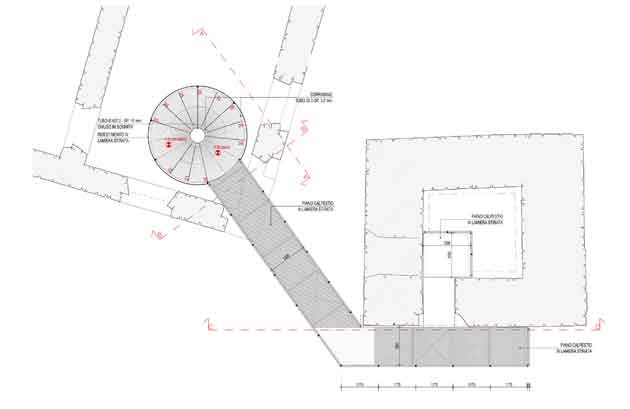 In primo piano, il volume in lamiera stirata che avvolge la scala a chiocciola