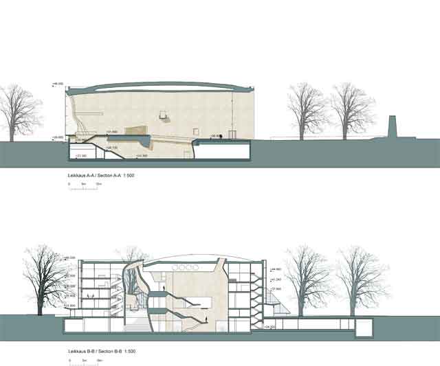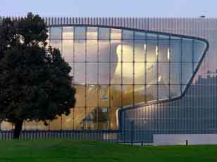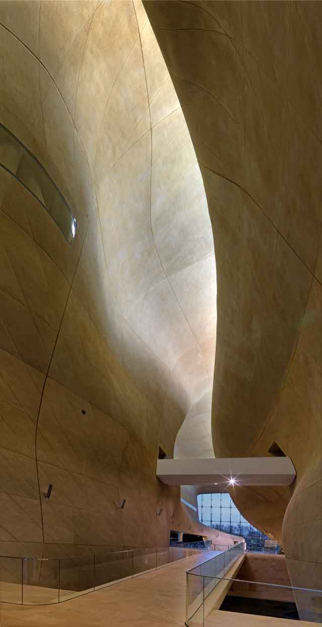 Il museo ha un impianto ortogonale razionale e si sviluppa su diversi livelli – uno dei quali interamente destinato a spazio espositivo di 4.000 mq posto sotto il livello d’ingresso, che ospitano una biblioteca, una caffetteria, negozi, un auditorium da 470 posti, spazi per uffici e aule didattiche. Il portale monumentale immette nell’enorme atrio-caverna percorso da scale, rampe e passerelle sospese che consentono ai visitatori di accedere su più livelli agli spazi espositivi. Le evoluzioni plastiche delle pareti curve, che costituiscono elementi strutturalmente portanti, sono visibili dall’esterno attraverso la trasparenza di una grande porzione del fronte sud-ovest.