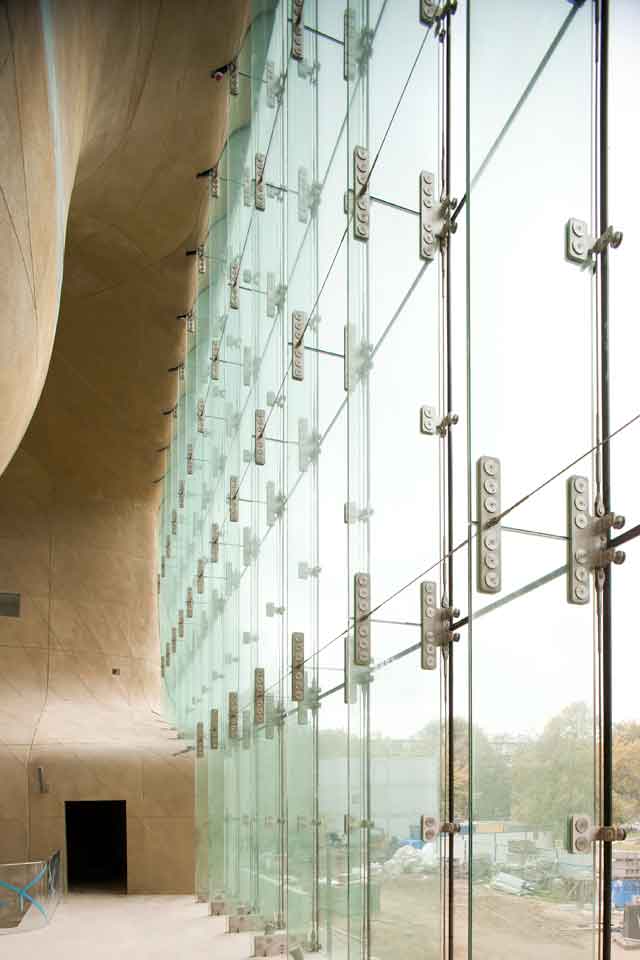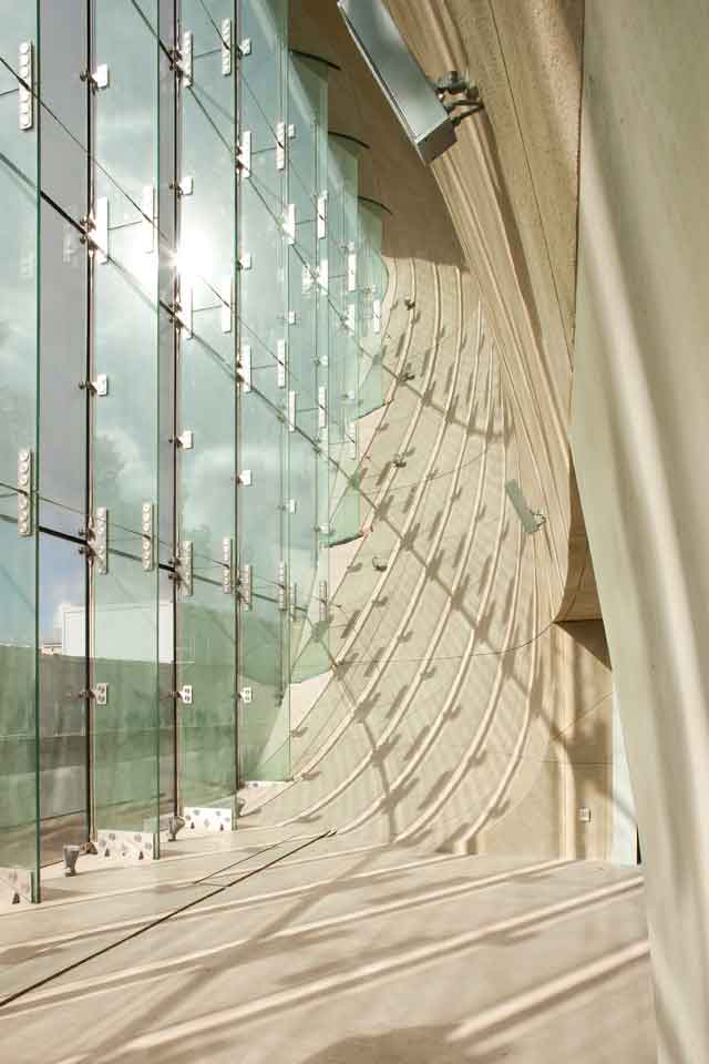 Particolare della facciata vetrata riflessa sulle pareti curve della hall (foto ©Juha Salminen)