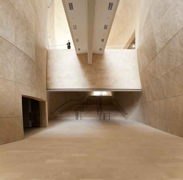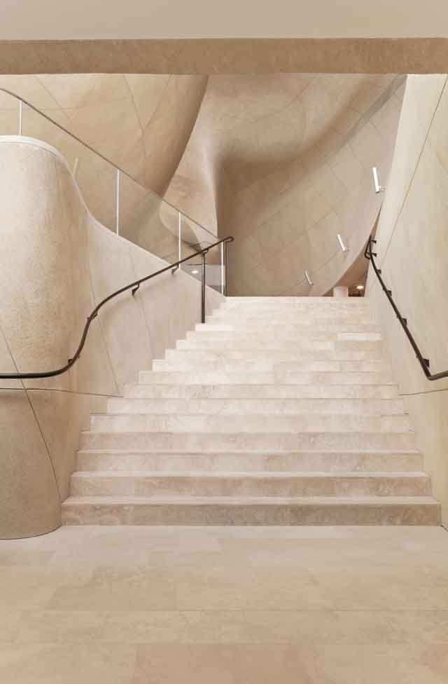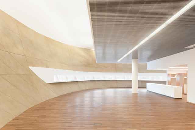 Il monumentale atrio d´ingresso del museo è definito da grandi superfici curve e strutturalmente portanti in spritzbeton che riprende il colore della pavimentazione in travertino e hanno rappresentato una vera e propria sfida progettuale (foto ©photo room)