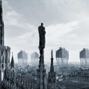 Il fronte ovest invece è interamente trasparente, con una facciata continua in vetro retta internamente da una struttura di acciaio e protetta all’esterno da una griglia di tondini d’acciaio bianchi. Analoga la protezione della scala esterna di servizio sulla facciata opposta, cieca.