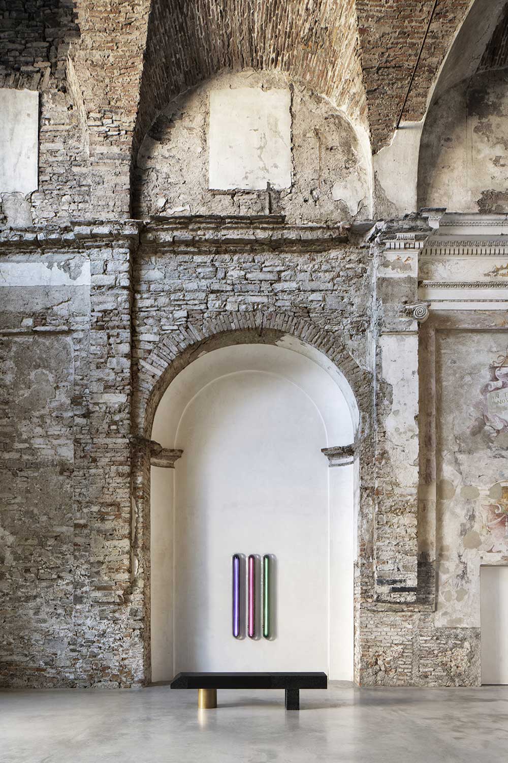 Tra parete affrescate, grandi vetrate e alti soffitti, i pezzi della collezione Transparency Matters trovano una dimensione inedita e si riempiono di nuovi significati. Accarezzati dalla luce che inonda l’ambiente, tavolini, console, panche, lampade e divisori diventano parte integrante dello spazio, della sua storia e patrimonio, restituendo a loro volta a questi luoghi un nuovo senso di bellezza.