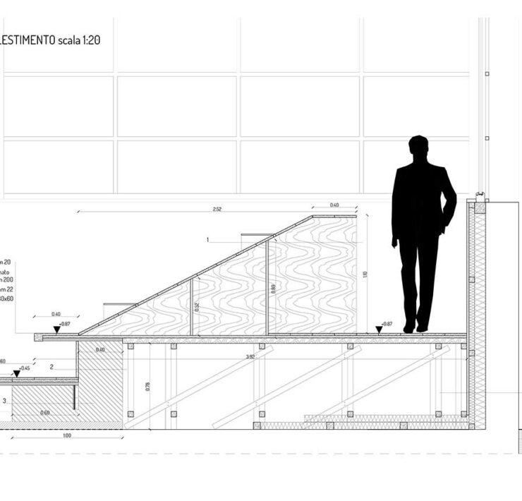 Anziché frammentare la continuità dello spazio interno introducendo divisorie verticali, che vengono ridotte al minimo, i vani vengono ricavati in orizzontale, tramite gli ampi ripiani in legno di rovere, lo stesso materiale della pavimentazione. Questi ultimi, oltre a definire un principio di circolazione interna e di rapporto visuale con l’esterno, celano indispensabili vani ripostiglio.