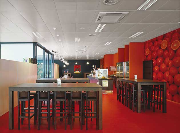 i pannelli Metal Clip-in possono essere personalizzati con fori, aperture e particolari per agevolare l’integrazione puntuale di elementi di servizio, come ad esempio corpi illuminanti, griglie per l’aria condizionata e sistemi di protezione antincendio.
