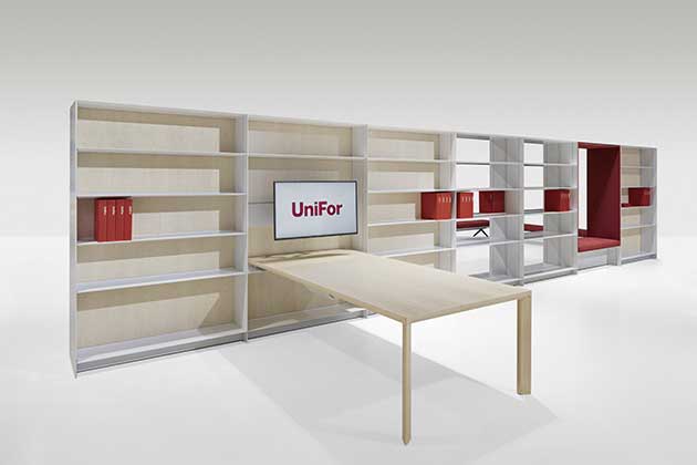 Completamente aperto sull’intorno, nel progetto curato dallo Studio Cerri lo spazio-ufficio di UniFor a Orgatec si presentava come un luogo di lavoro reale, strutturato in zone funzionali differenziate (reception, spazi operativi e direzionali aperti, sala riunioni), aperte sull’area trasversale del fronte principale, dove confluiscono le attività condivise e di relazione e si intersecano i percorsi.