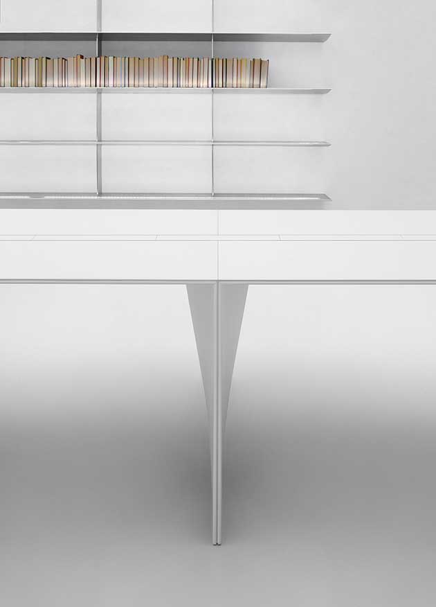 Libreria CF, Dante Bonuccelli, 2007_2018 Sistema di librerie modulari attrezzate – monofacciali a parete e bifacciali autoportanti. Ripiani e montanti in alluminio agganciati tra loro e fissati a un basamento in lamiera di acciaio: tutti elementi riciclabili, leggeri e facili da trasportare e montare, disponibili in varie altezze e dimensioni modulari. Ogni realizzazione può essere personalizzata grazie a un’ampia gamma di accessori: illuminazione diretta e indiretta a LED, sensori di temperatura e umidità, sistema di ricircolo dell’aria, cablaggi per connessione rete e dati, info display, ante scorrevoli, elementi espositori, ripiani estraibili, cassetti, contenitori, supporti monitor, vano seduta rivestito in tessuto e attrezzato con panca dotata di imbottitura in poliuretano, scala scorrevole o ad aggancio. |