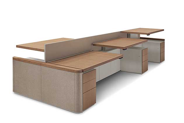 Eleganti postazioni professionali Signum (Gensler Product Design) regolabili in altezza nella configurazione con scrivanie aggregate fronteggianti in linea caratterizzavano invece l’area direzionale a spazio aperto.