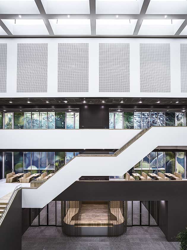 I due volumi dei laboratori sono tra loro collegati dal vasto ambiente collettivo dell’Atrium, uno spazio a tutt’altezza ricco di verde e decorato da elaborazioni grafiche di immagini scientifiche fornite dai vari dipartimenti dell’Università.