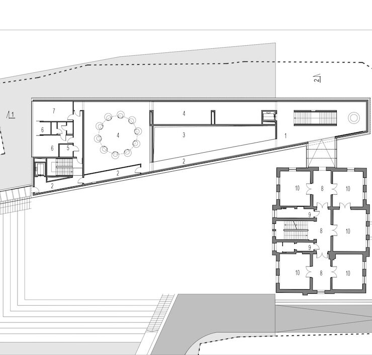 Il secondo piano ospita anche una sala conferenze e il collegamento tra i due edifici. Il passaggio sospeso vetrato offre un interessante punto di vista su entrambi i blocchi e sui dintorni.