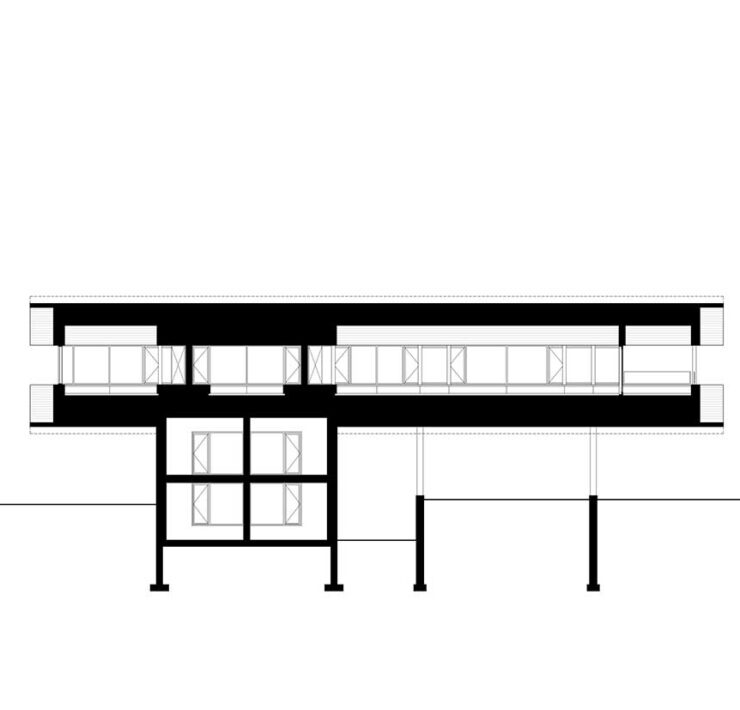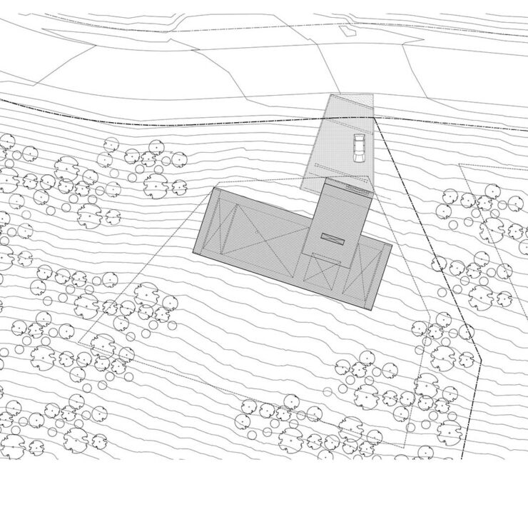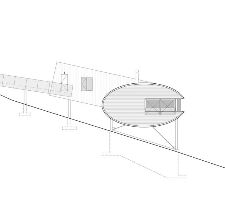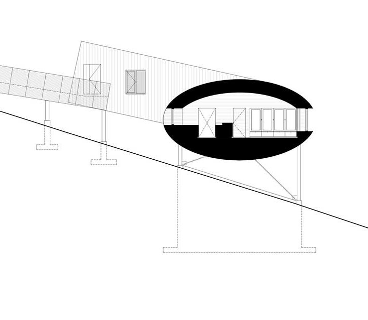 L’orientamento e l’involucro rispondono alle condizioni climatiche con l’esposizione principale a sud e un rivestimento esterno e interno in legno di cedro rosso, mentre la pendenza e gli accumuli di neve sono stati affrontati sospendendo su alte colonne in acciaio il corpo principale della casa, retta al centro da un nucleo in cemento armato.