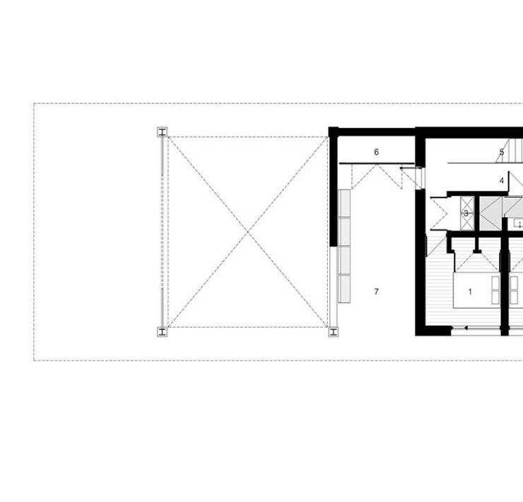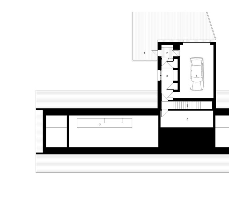 Dall’ingresso una scala – che riceve luce zenitale da un lucernario – attraversa il blocco di servizio, dove depositare gli sci, per scendere verso l’ampia zona giorno, con un grande living esposto a sud.