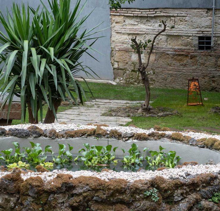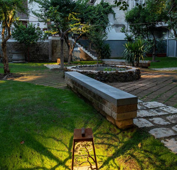 La vasca al centro della piccola oasi di quiete. Sul fondo, la sediola donata da Carlo Cuomo (ph. ©Luigi Spina).