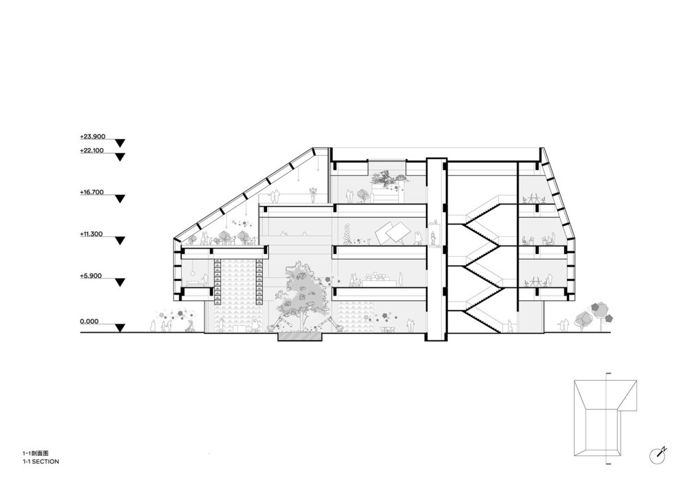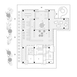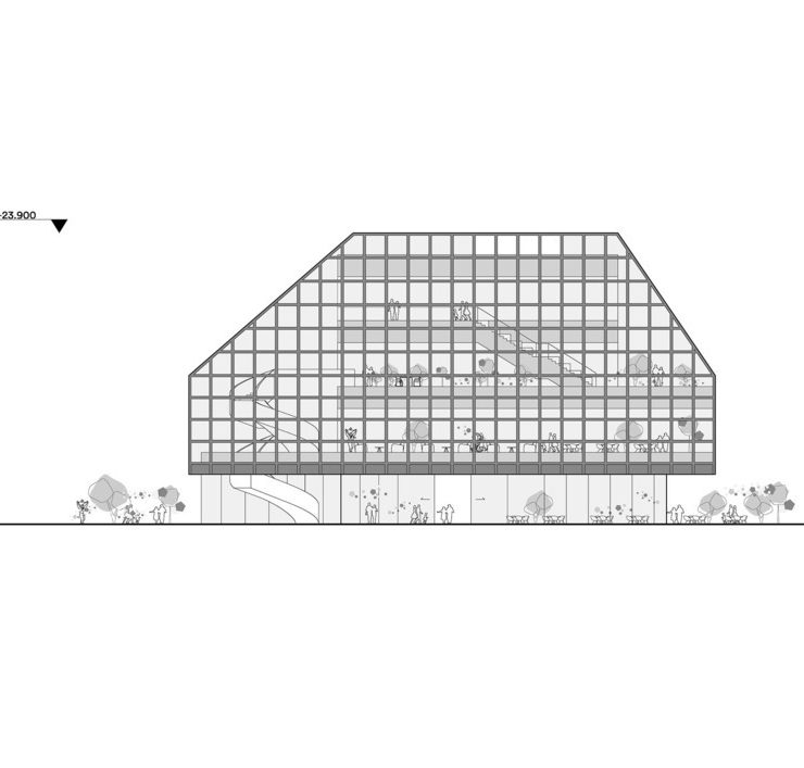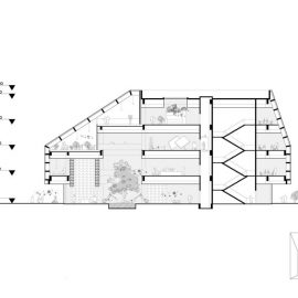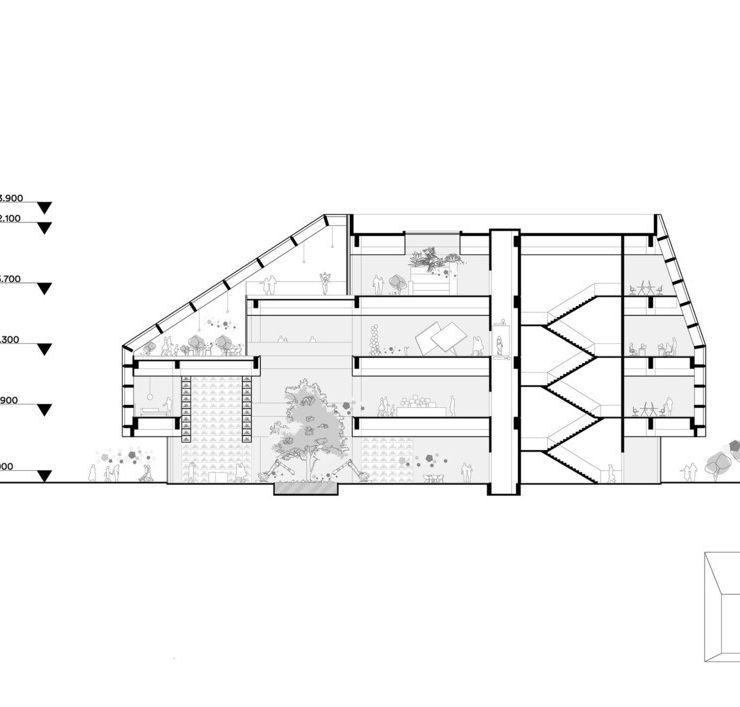La struttura architettonica è stata sviluppata per dare vita a uno spazio pubblico esterno strettamente collegato con l’interno attraverso la combinazione strategica dei quattro livelli dell’edificio.