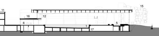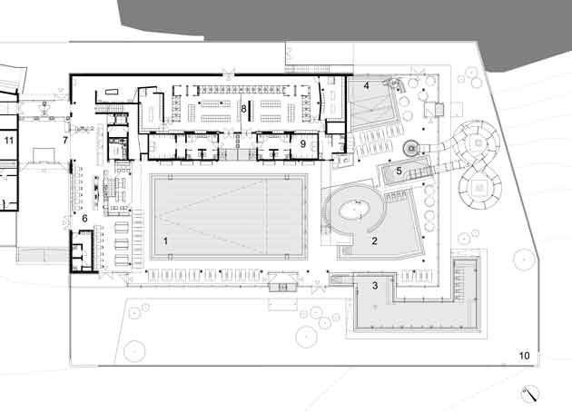 Nella pianta del piano terra e nella sezione, le funzioni dell´edificio: 1.vasca natatoria, 2.vasca fun, 3.vasca esterna acqua salata, 4.vasca ric. bambini, 5.vasca di ammaraggio scivolo, 6.bar/bistro, 7.ingresso/ biglietteria, 8.spogliatoi, 9.servizi igienici/docce, 10.prato, 11.centro benessere esistente, 12.soppalco/zona relax, 15.scivolo, 16.terrazza, 17.vani tecnici