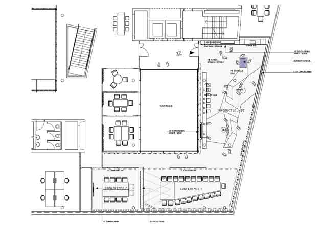 Qui, pareti nere in vetro e arredi dalle forme fluide e dinamiche realizzati in pietra acrilica Hi-Macs sono stati dotati di tecnologie Microsoft Kinect (estensione per PC dei sensori di movimento inizialmente realizzati per X-Box) e Surface (il tablet di Microsoft) per creare interazione tra i consulenti dell’azienda, gli utenti e i prodotti: la presentazione può essere fatta in piedi o da seduti, passando rapidamente da una presentazione di gruppo a un incontro individuale. La transizione fluida da conversazione in piedi a presentazione pratica da seduti consente di rispondere individualmente ai vari clienti.