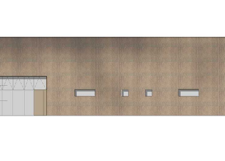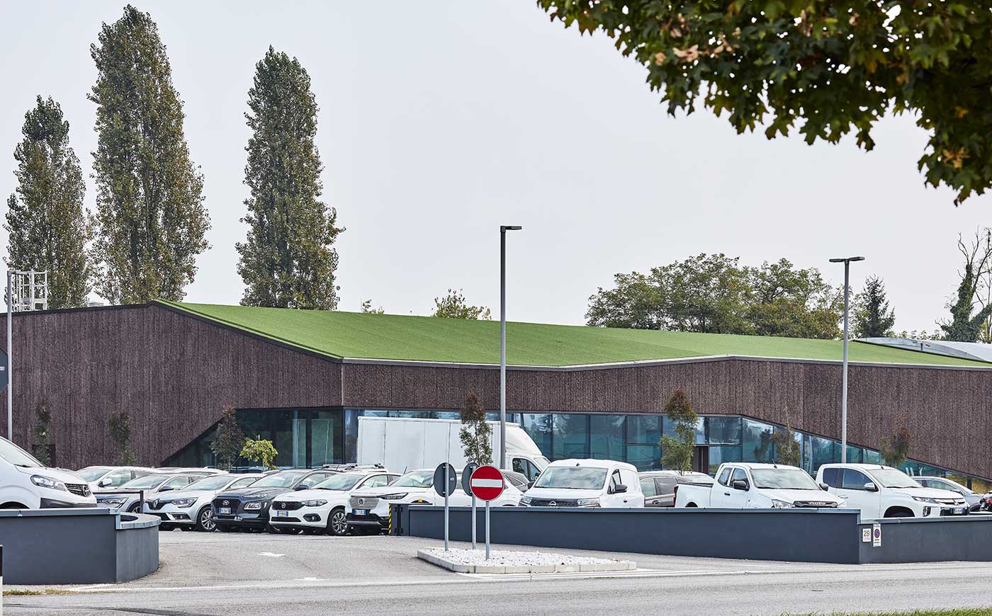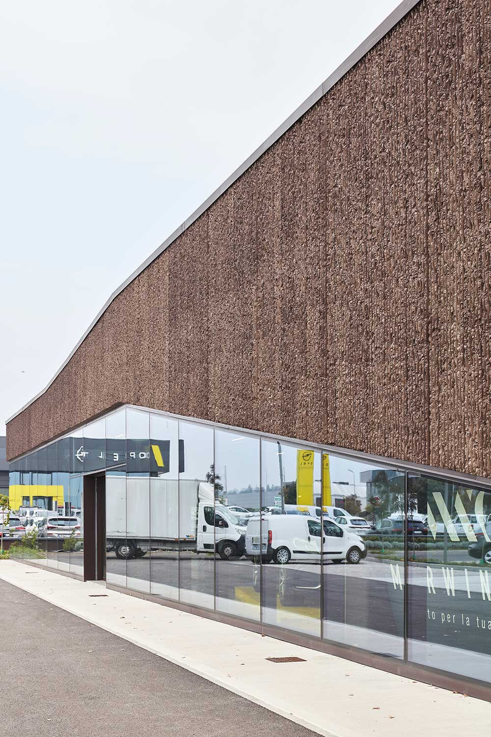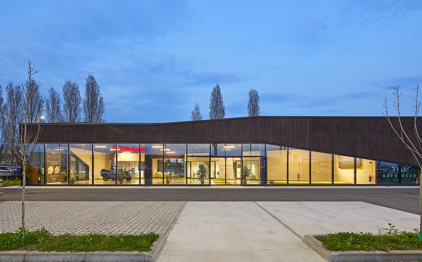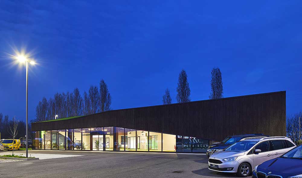 Articolato su un solo piano fuori terra e a pianta rettangolare (circa 40 metri per 19 di profondità), l’edificio, collocato tra altri due edifici a destinazione commerciale, ospita gli uffici un autosalone e uno spazio di manutenzione dei veicoli, oltre a ambienti tecnici, su una superficie complessiva di 740 metri quadrati.