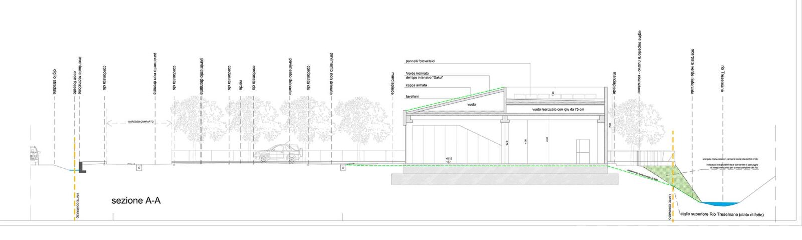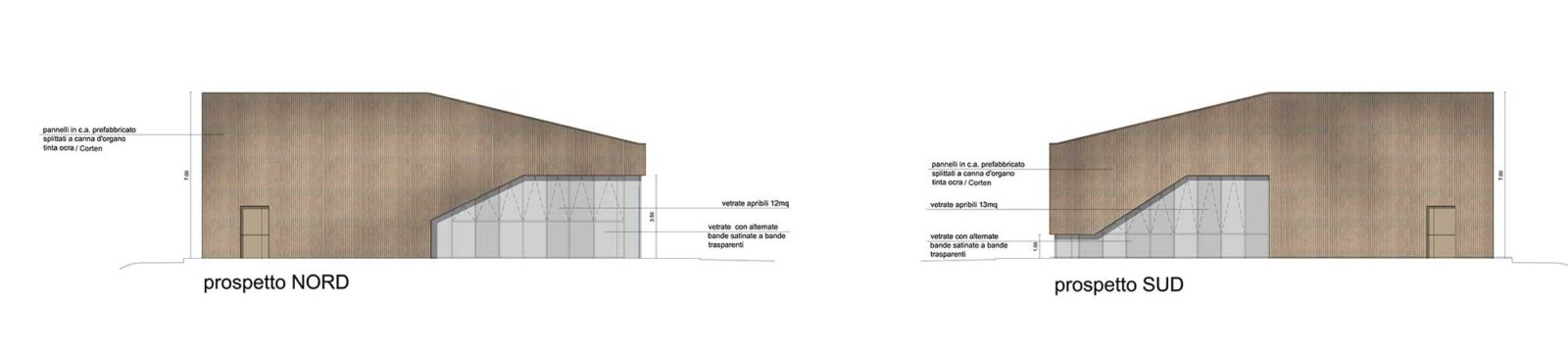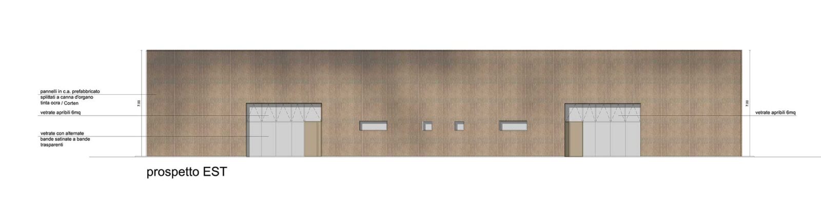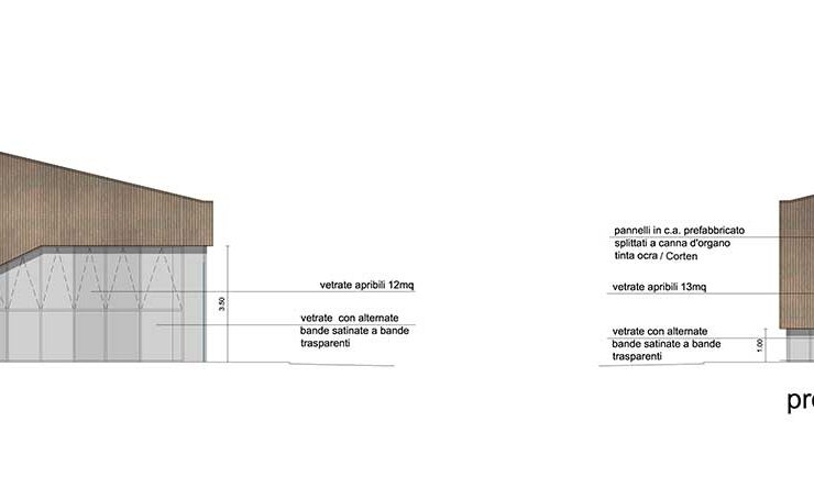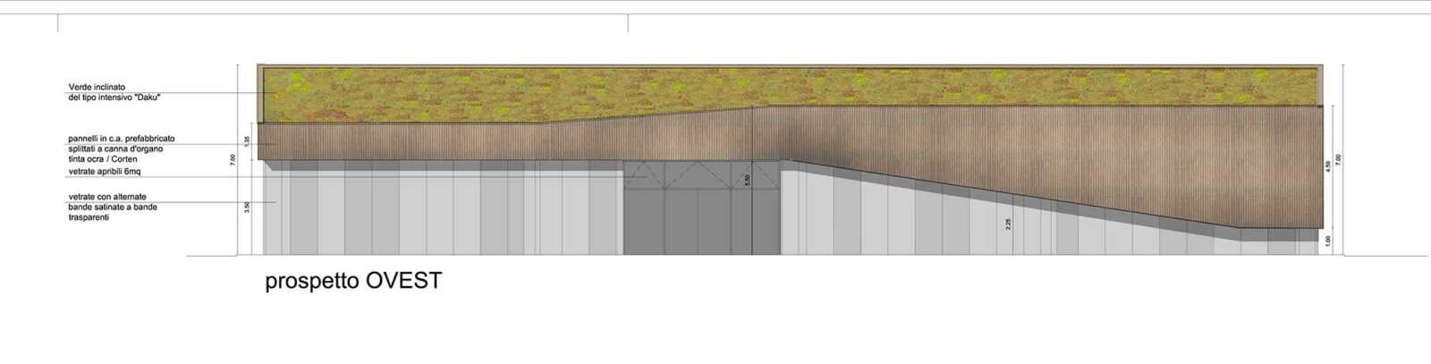 Il gesto compositivo è ancestrale: uno scavo che estrae dal suolo una zolla di terreno che rimane idealmente sospesa da terra per ospitare al di sotto l’attività commerciale.