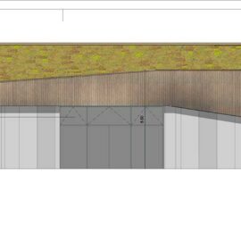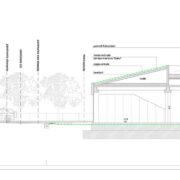 La massa si sgancia dal suolo grazie ad una facciata in vetro continua che in modo irregolare la taglia, liberando così il volume e sospendendolo. La copertura rivestita in erba sintetica rafforza l’idea della zolla.