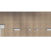 L’involucro in calcestruzzo è caratterizzato da una lavorazione con matrici verticali che imitano la rugosità del terreno, e accentuano con la loro verticalità il senso di estrazione dal suolo. Una successiva velatura marrone onferisce ulteriore effetto materico e di imperfezione al tutto.