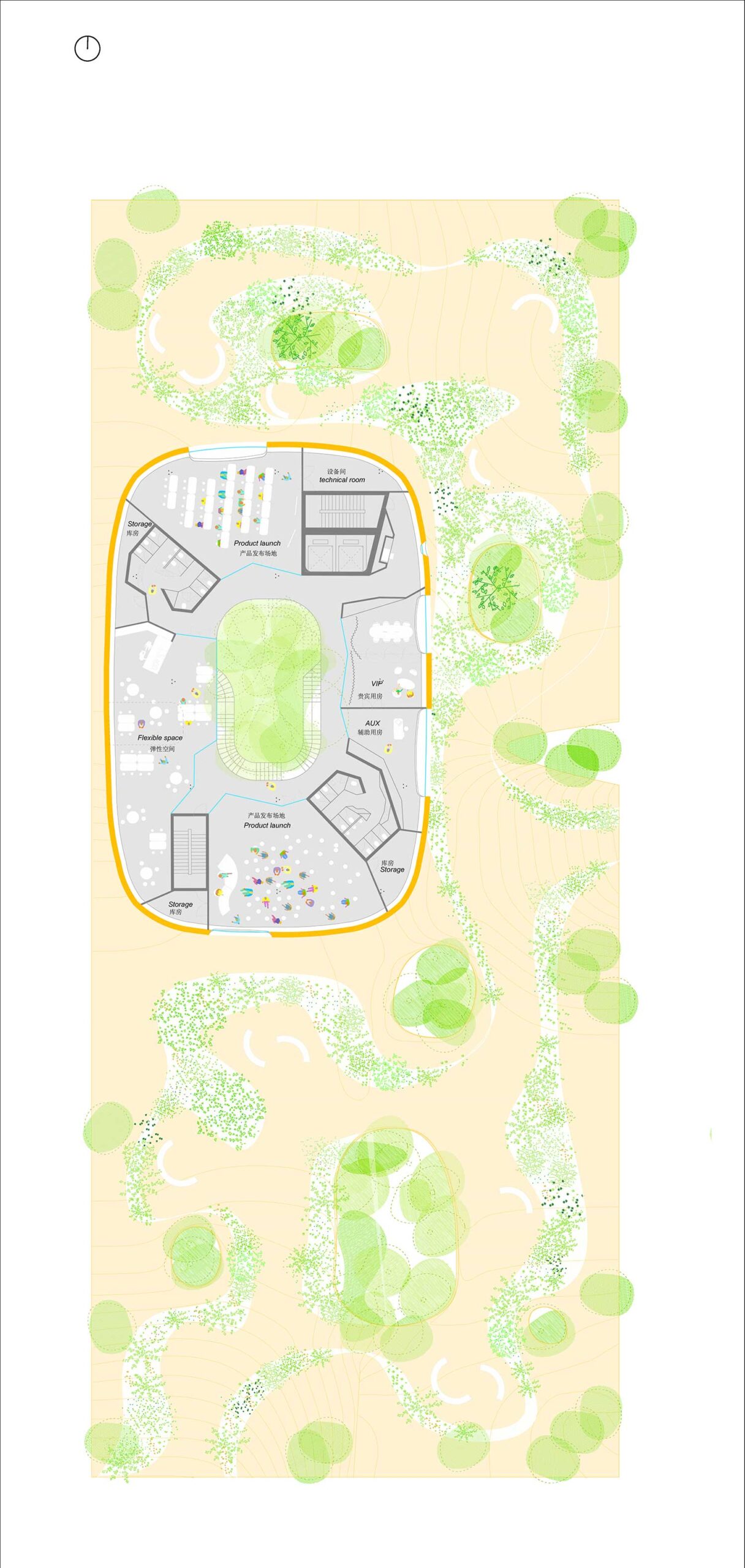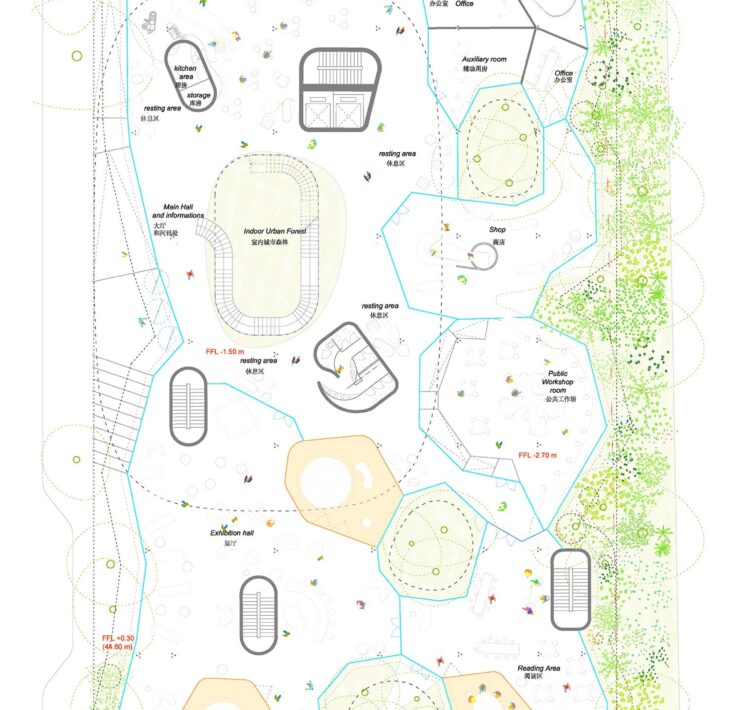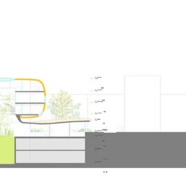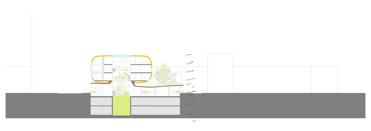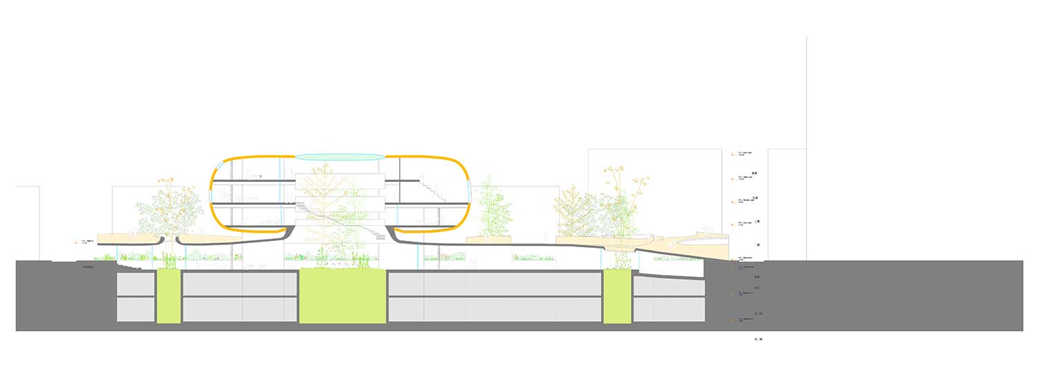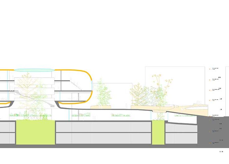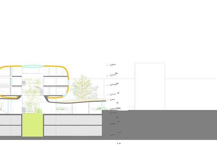 Il piano terra, collocato a una quota di 1,5/2 metri sotto il piano stradale, è come una tela bianca delimitata da una cornice trasparente, punteggiata da collegamenti – con l’esterno e con i livelli superiori – attraversata da flussi e al centro della quale un’apertura che attraversa tutti i livelli porta all’interno alberi e arbusti.
