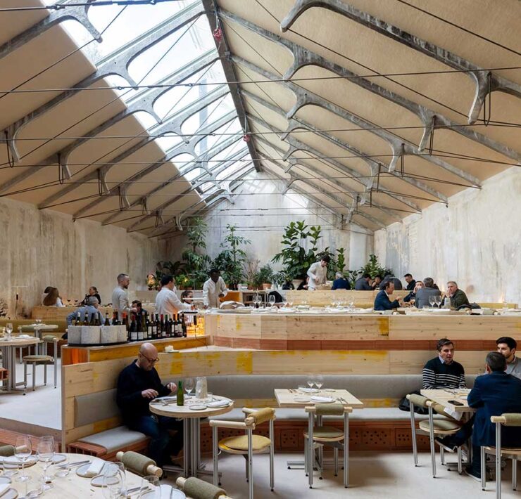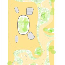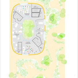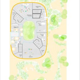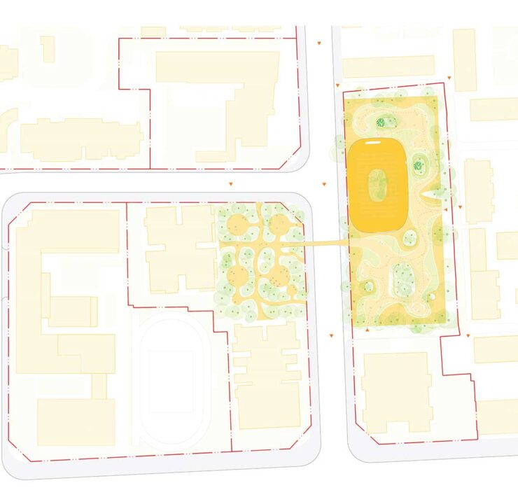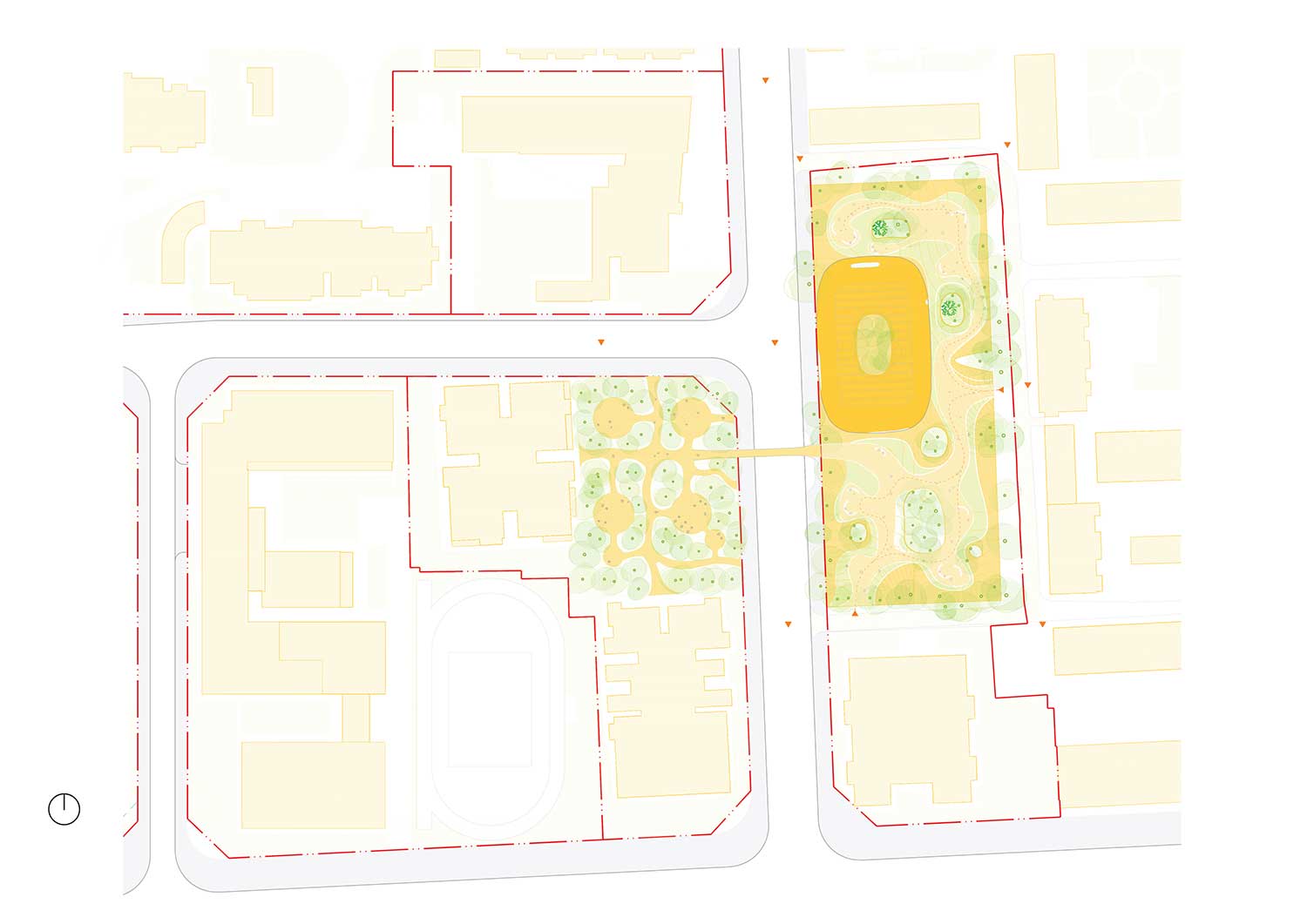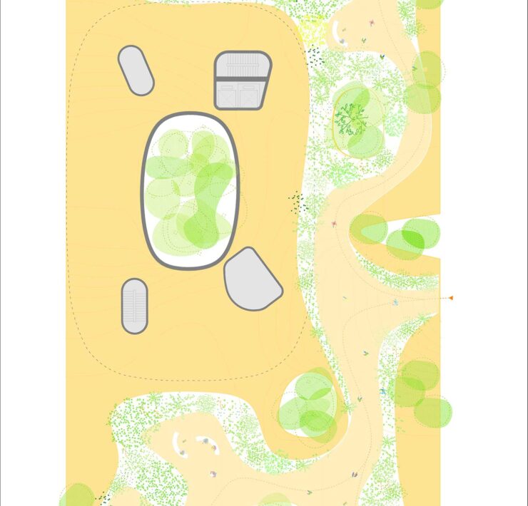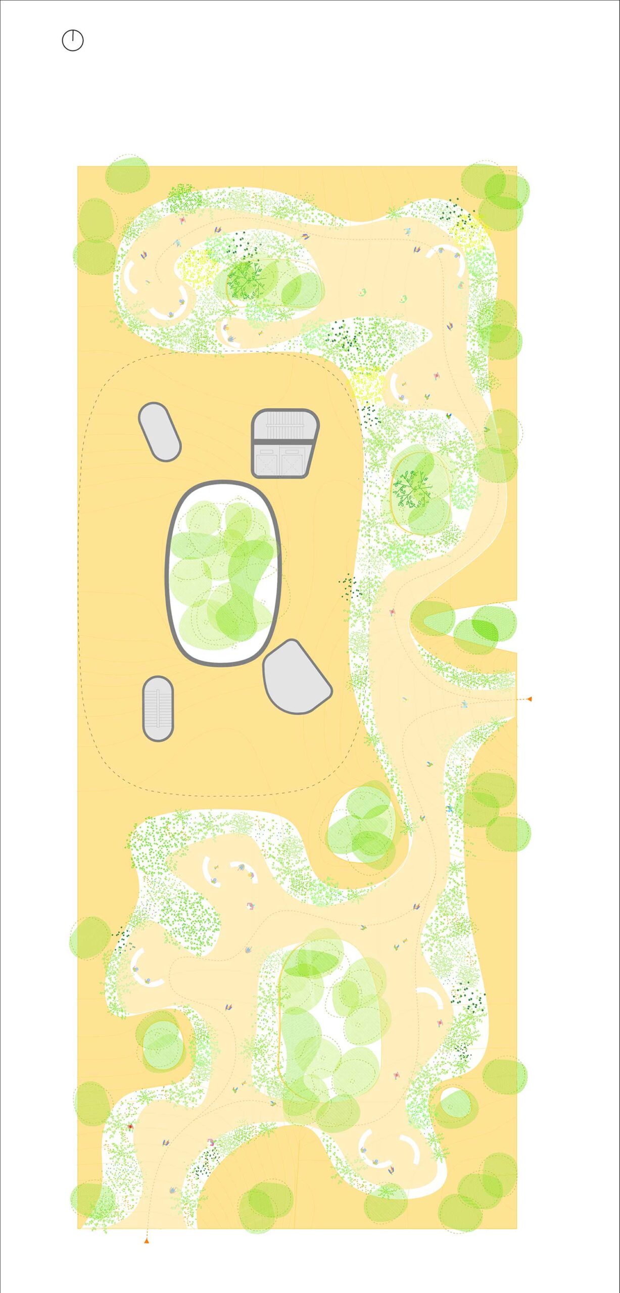 Il piano terra, collocato a una quota di 1,5/2 metri sotto il piano stradale, è come una tela bianca delimitata da una cornice trasparente, punteggiata da collegamenti – con l’esterno e con i livelli superiori – attraversata da flussi e al centro della quale un’apertura che attraversa tutti i livelli porta all’interno alberi e arbusti.